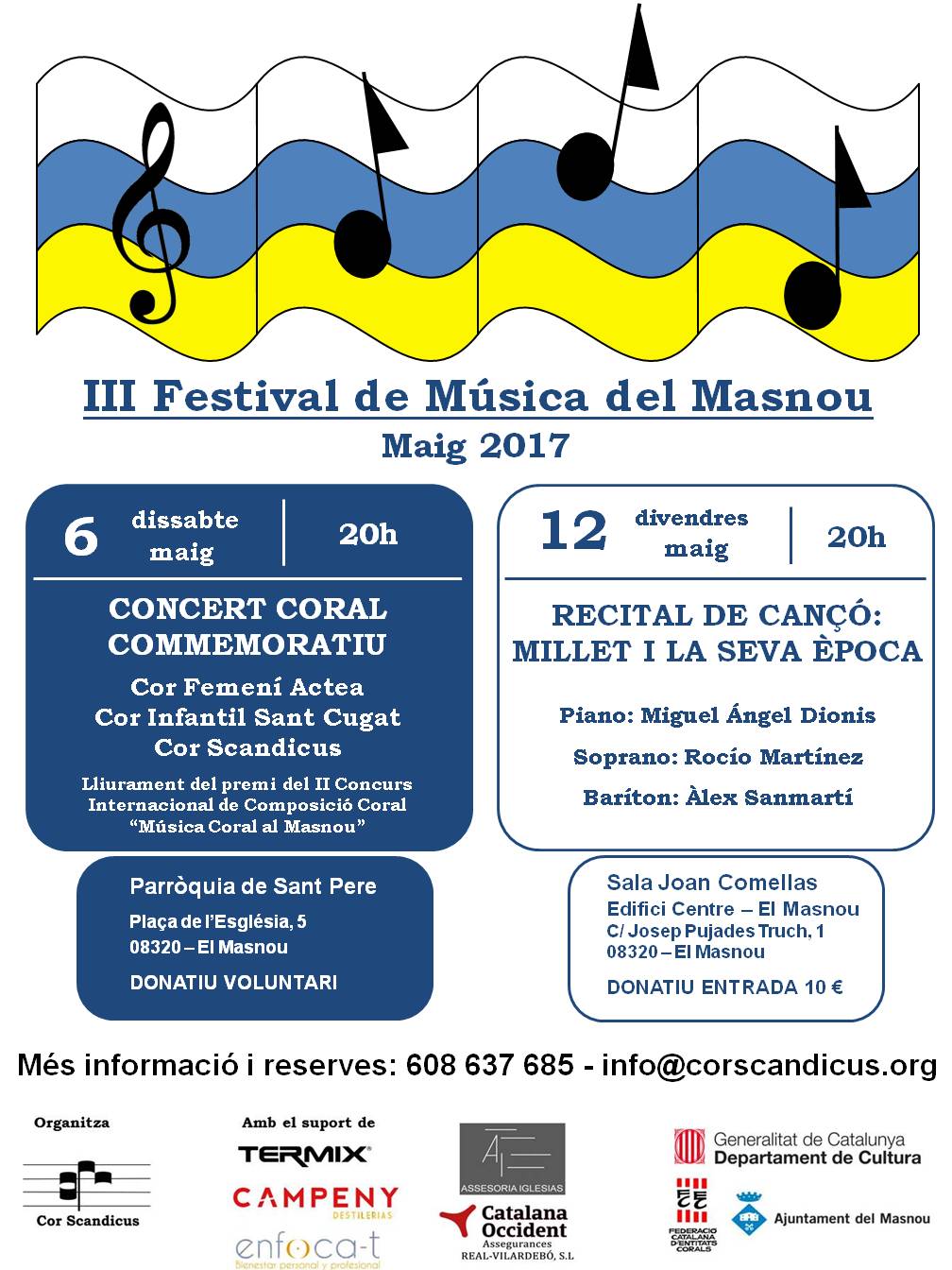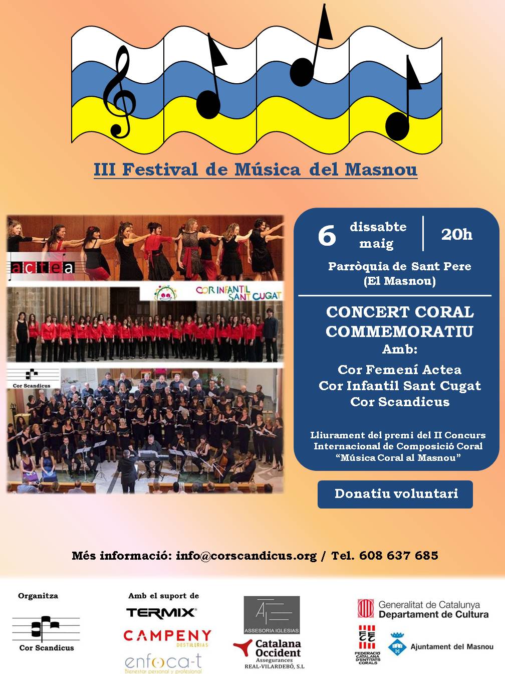 Primer concert del III Festival de Música del Masnou: Concert coral a l’Església de Sant Pere (El Masnou) que va comptar amb la participació del cor femení Actea, el Cor infantil Sant Cugat i Cor Scandicus. Va tenir lloc el lliurament del premi de la II edició del Concurs internacional de composició coral “Música Coral al Masnou”, que es va atorgar al compositor veneçolà Víctor Daniel Lozada per la seva obra “Canción de cuna para Panchito”.