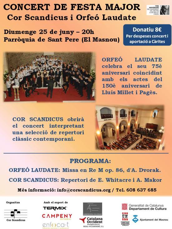 Cor Scandicus va convidar a la veterana coral barcelonina Orfeó Laudate en concert per commemorar el seu 75è aniversari coincidint amb el 150è aniversari del naixement de Lluís Millet. Orfeó Laudate va interpretar la Missa en Re M op. 86, d’A. Dvorak, sota la direcció de David Malet. Cor Scandicus va obrir el concert amb repertori clàssic contemporani de E. Whitacre i A. Makor.